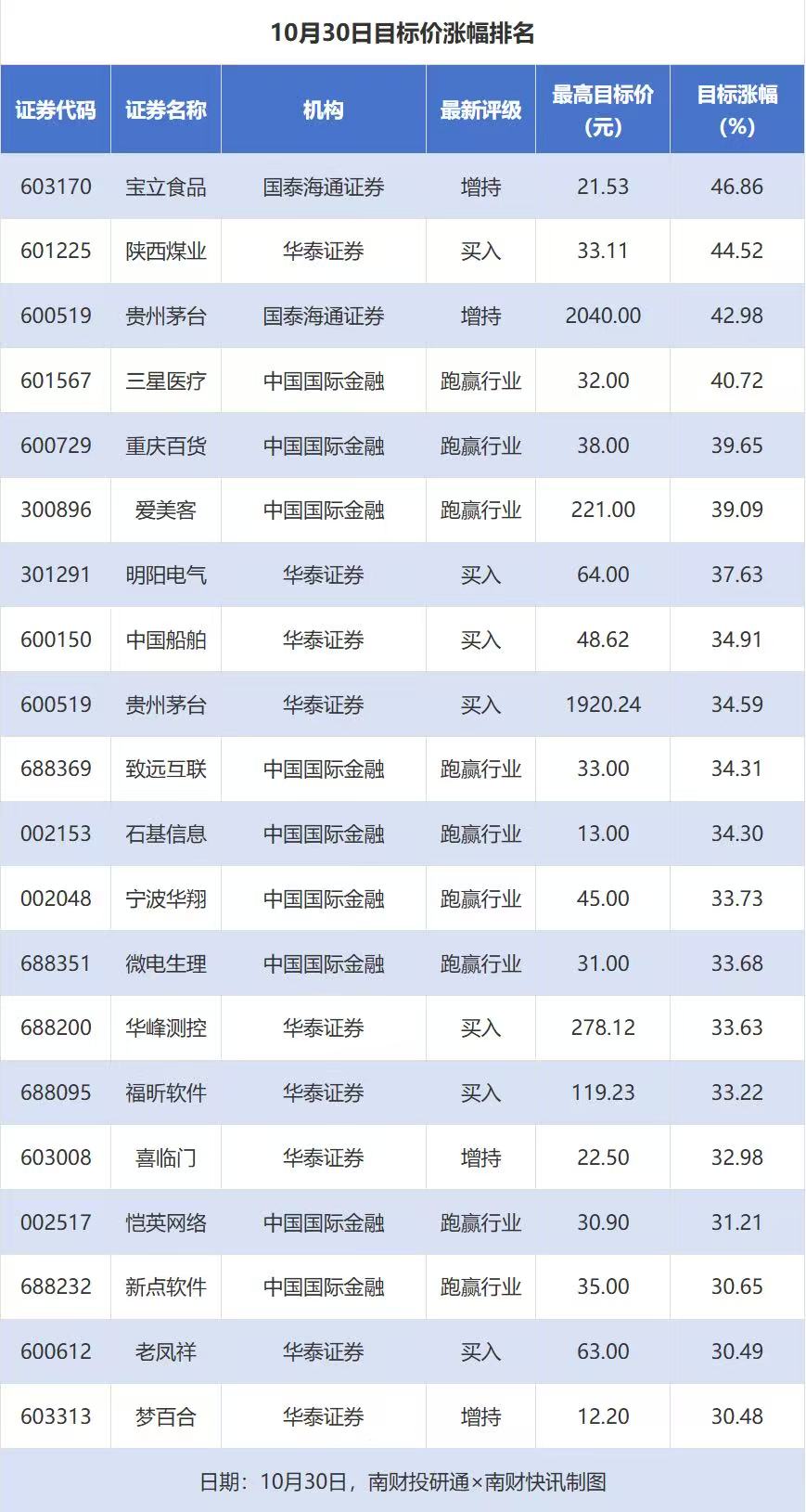 南财投研通数据显示,10月30日,券商给予上市公司目标价共76次,按最新收盘价计算,目标价涨幅排名居前的公司有宝立食品、陕西煤业、贵州茅台,目标价涨幅分别为46.86%、44.52%、42.98%,分别属于调味发酵品、煤炭开采、白酒行业。