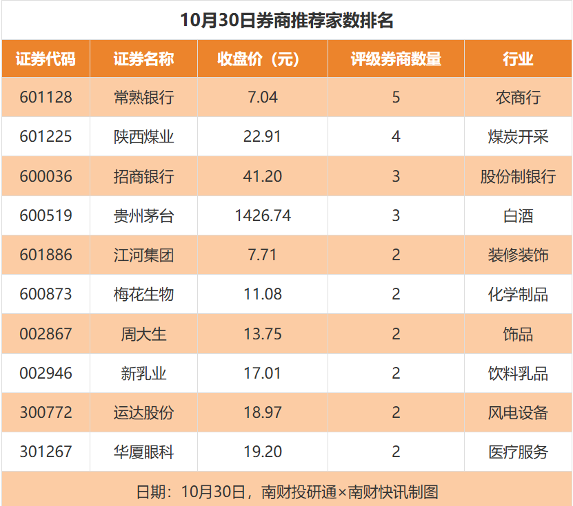 从券商推荐家数来看,10月30日有114家上市公司得到券商推荐,其中常熟银行获得5家推荐,陕西煤业获得4家推荐,招商银行获得3家推荐。