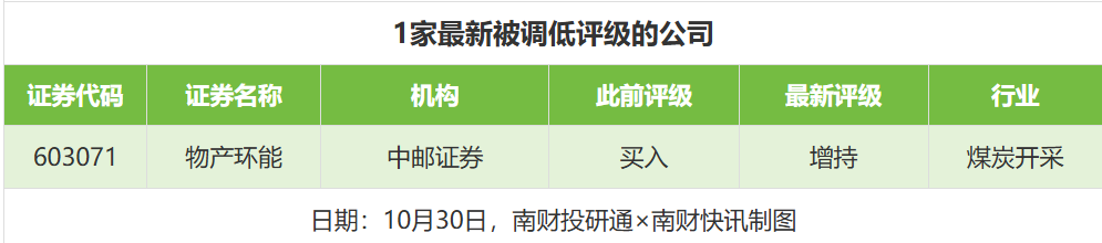 评级调低方面,10月30日,券商调低上市公司评级达到1家次,最新数据包括了中邮证券对物产环能的评级从“买入”调低至“增持”。
