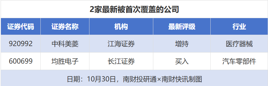 首次覆盖方面,10月30日券商共给出了2次首次覆盖,其中中科美菱获得江海证券给予“增持”评级,均胜电子获得长江证券给予“买入”评级。